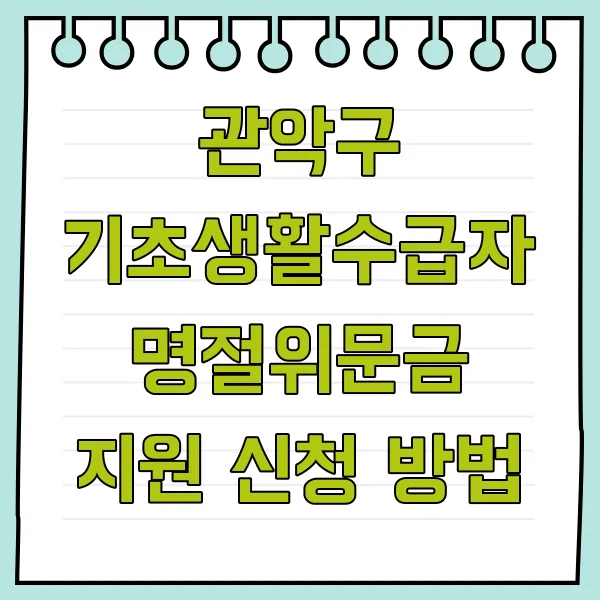 관악구 명절위문금은 기초생활수급자 중 생계급여 및 의료급여 수급자 가구에 지원됩니다. 이는 경제적인 어려움을 겪는 분들에게 실질적인 도움을 드리고자 하는 관악구의 따뜻한 마음을 담고 있습니다. 단, 입양대상아동 및 시설수급자는 해당 지원 대상에서 제외된다는 점, 참고 부탁드립니다!